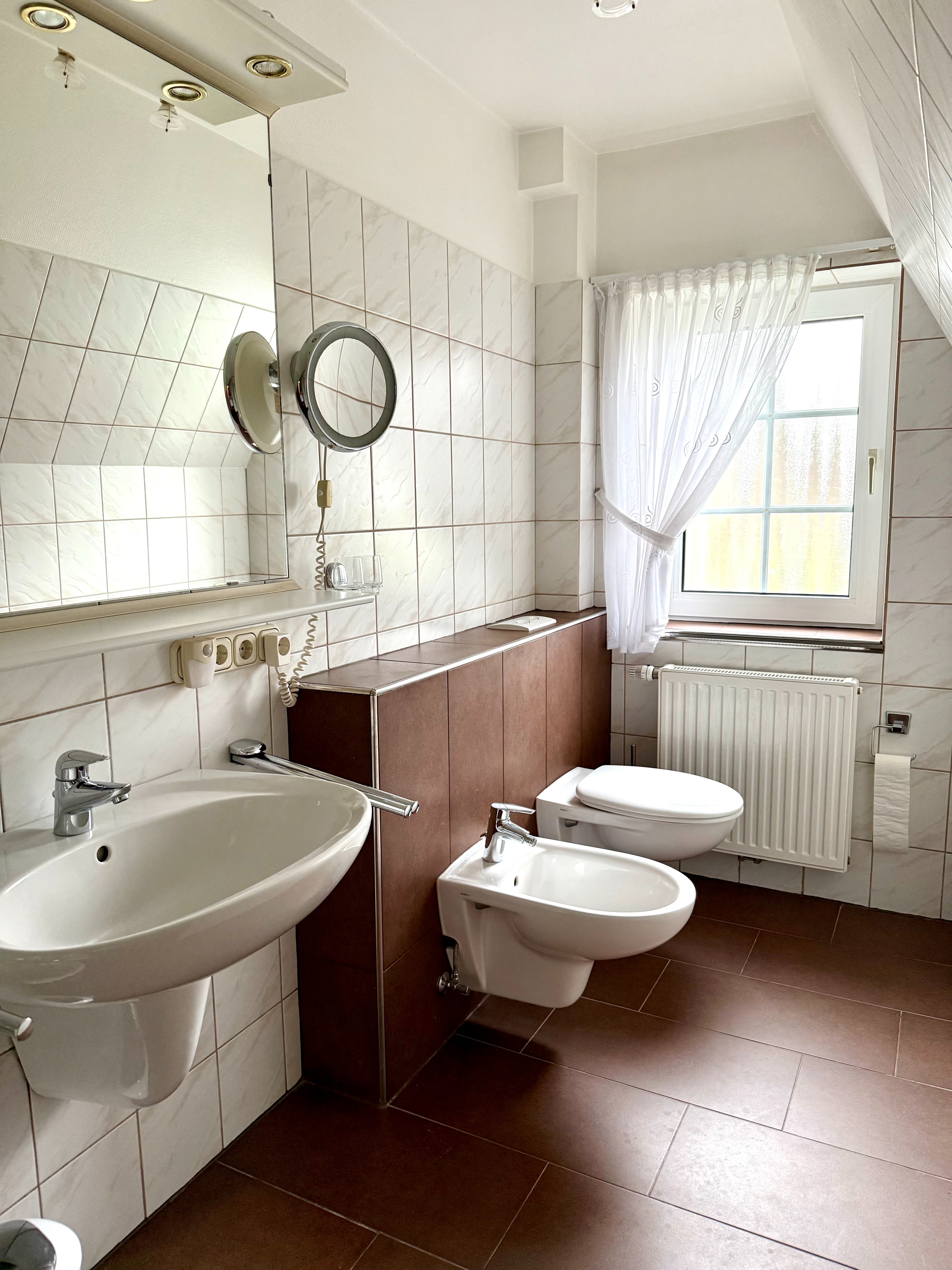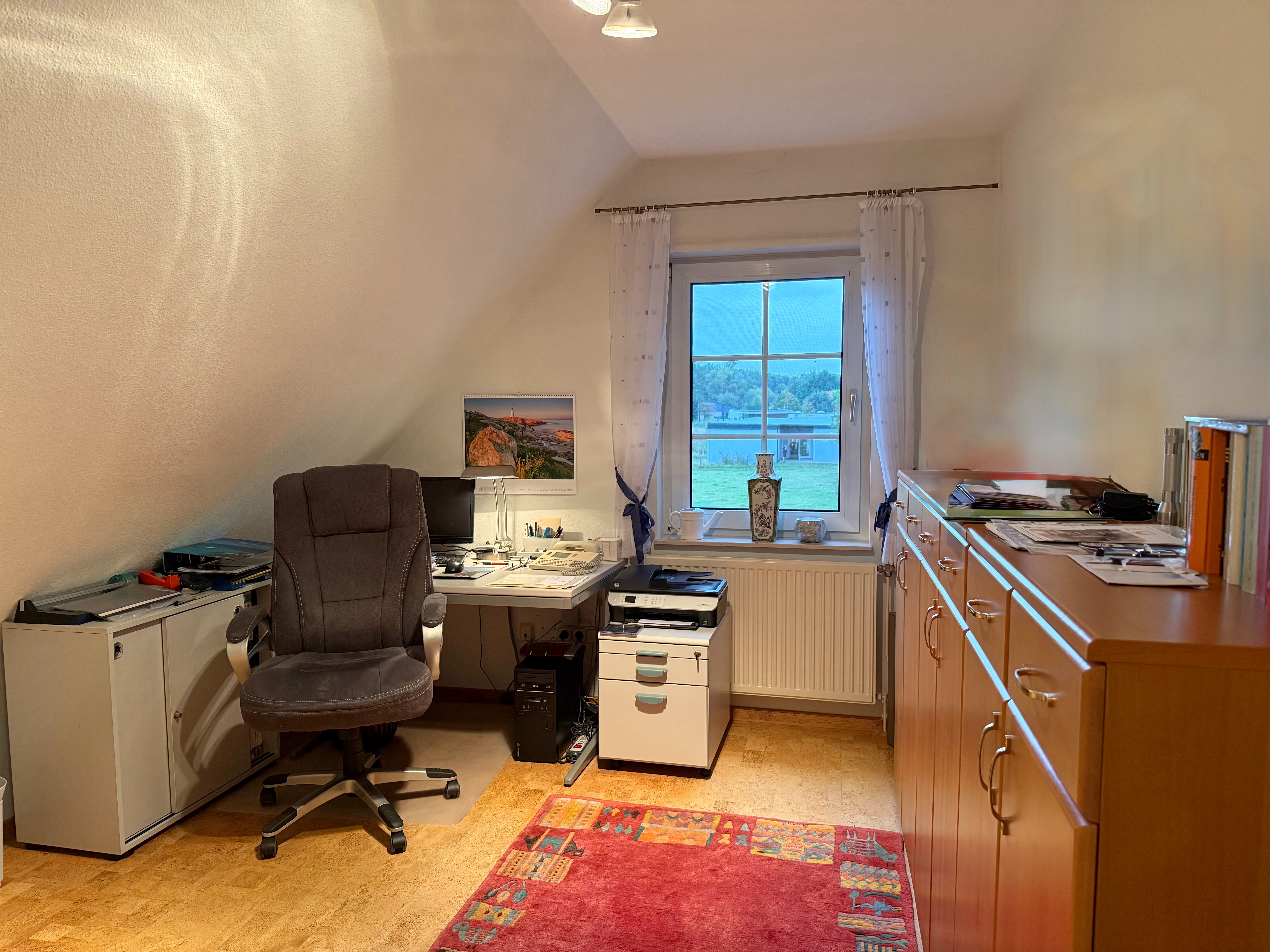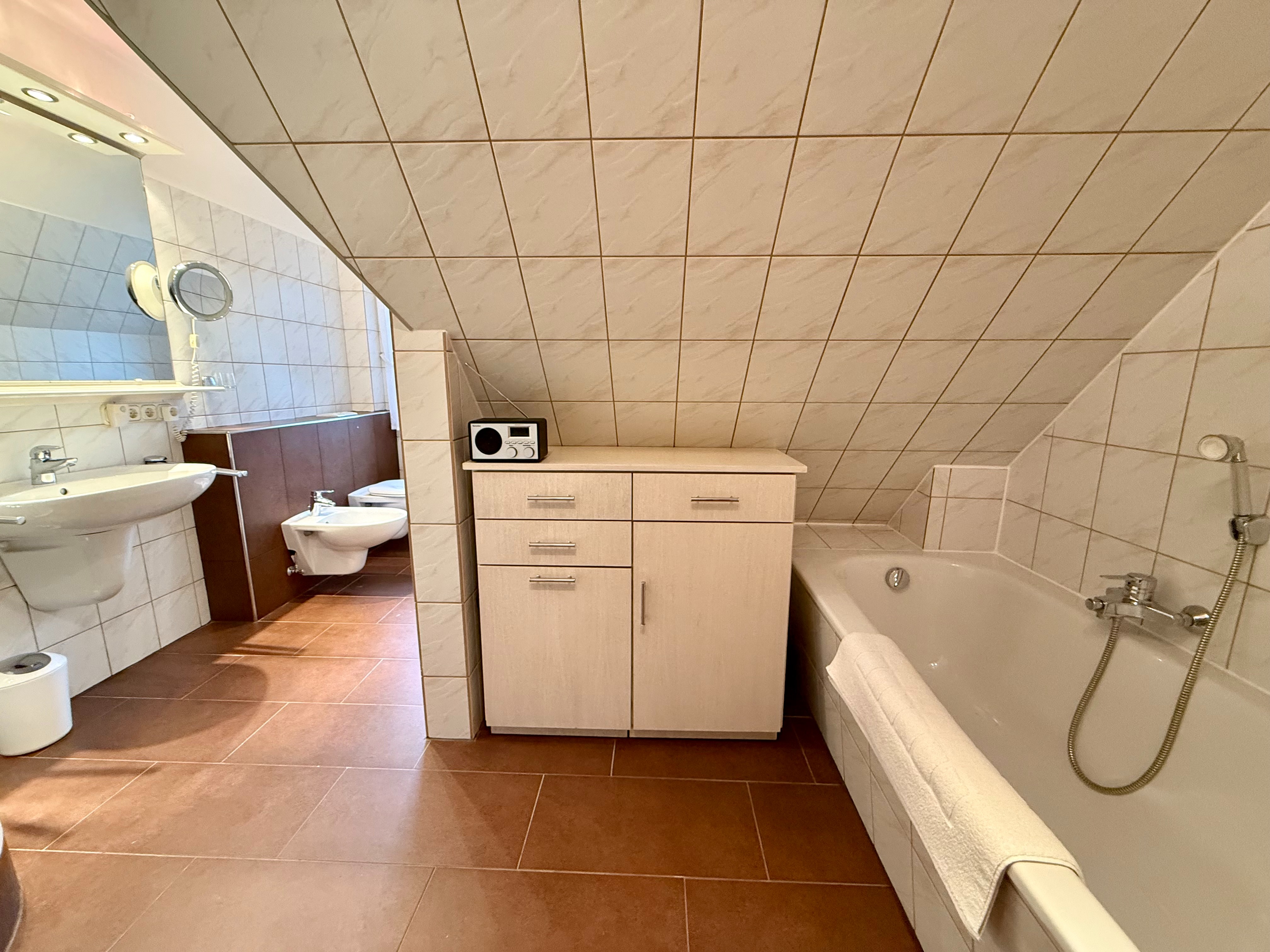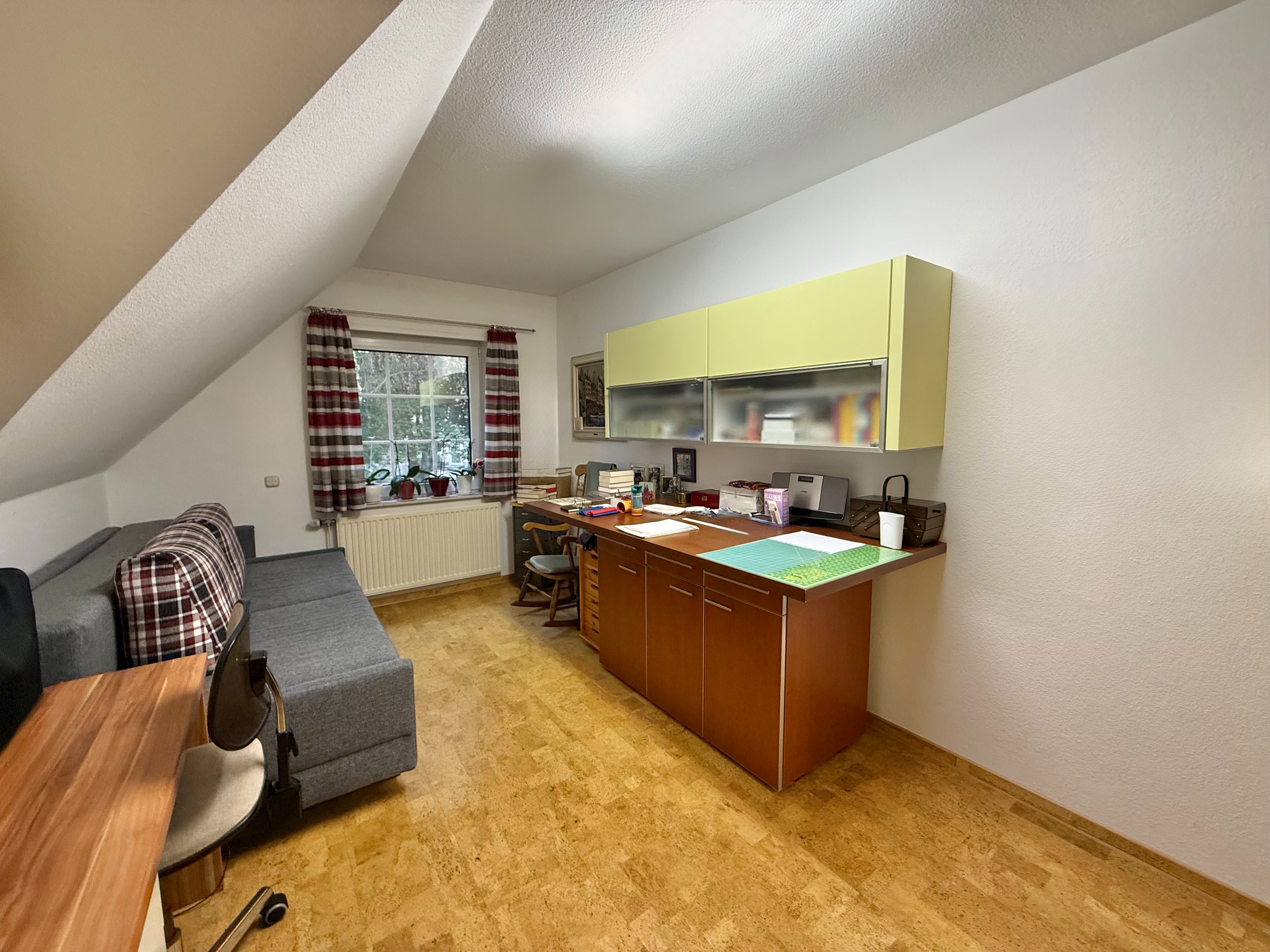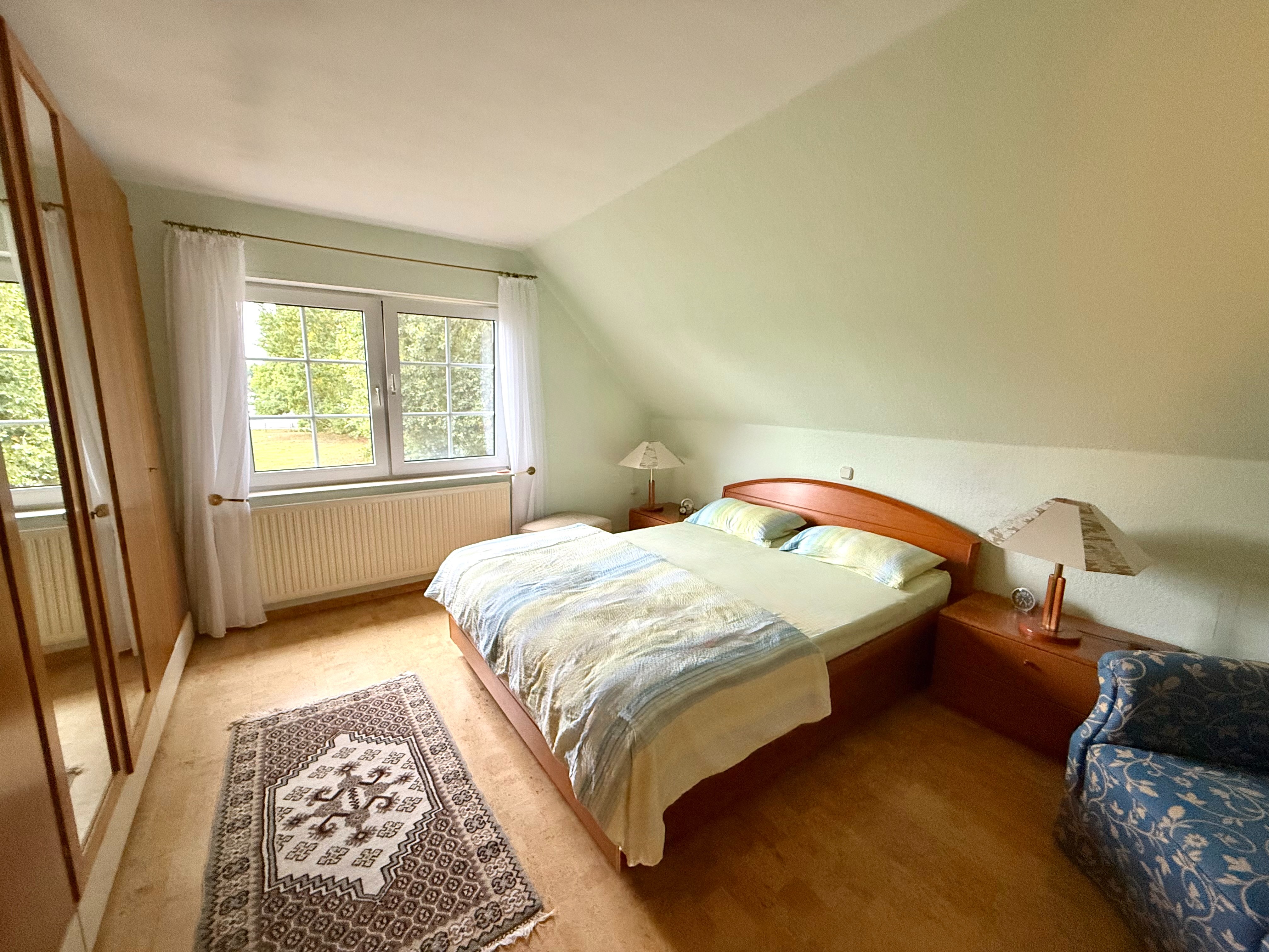 Im Obergeschoss prägen charmante Dachschrägen das gemütliche Wohngefühl. Hier befinden sich zwei kleinere Schlafräume, ein großes Elternschlafzimmer sowie ein Tageslichtbad mit Dusche und Badewanne.