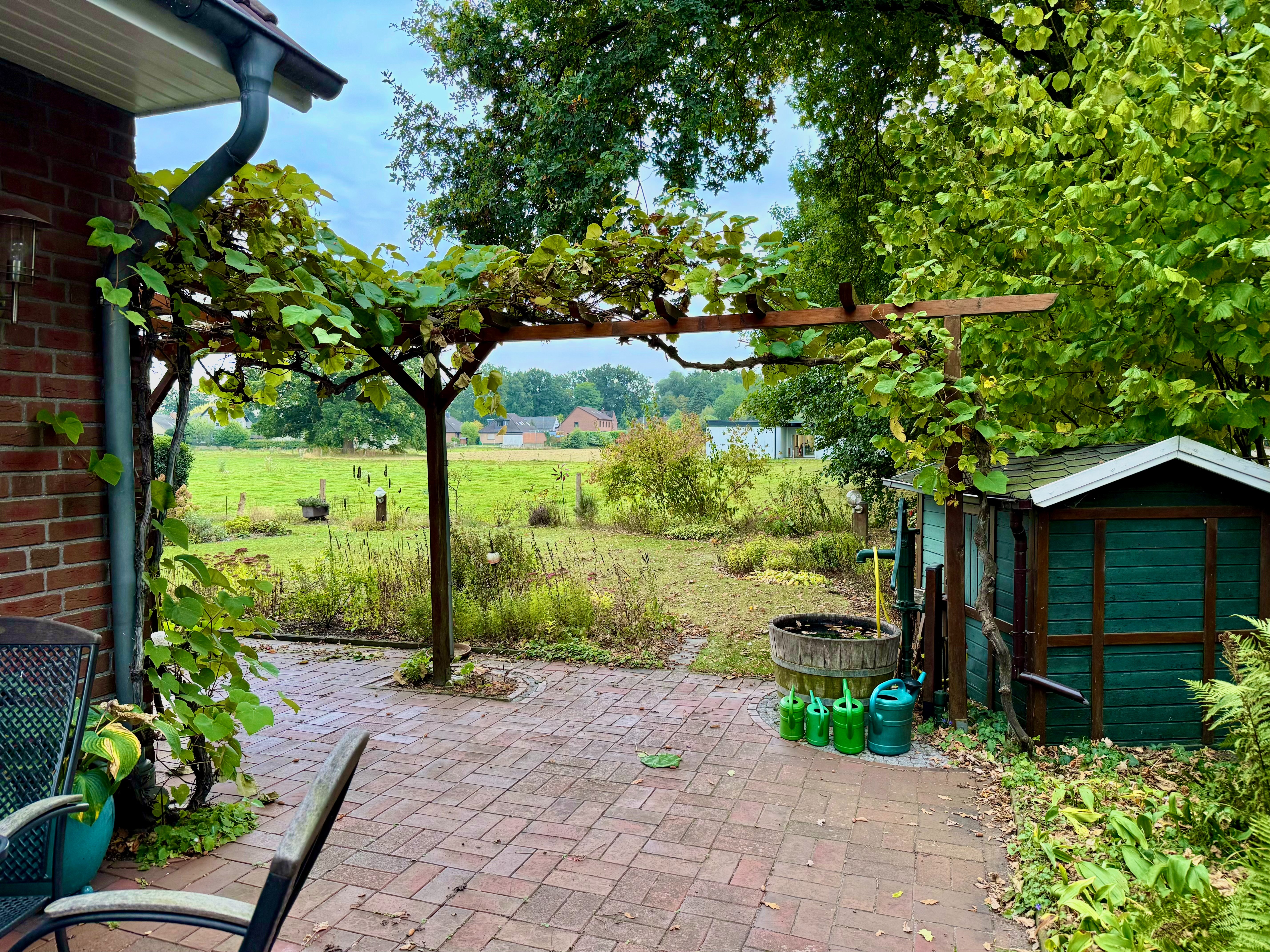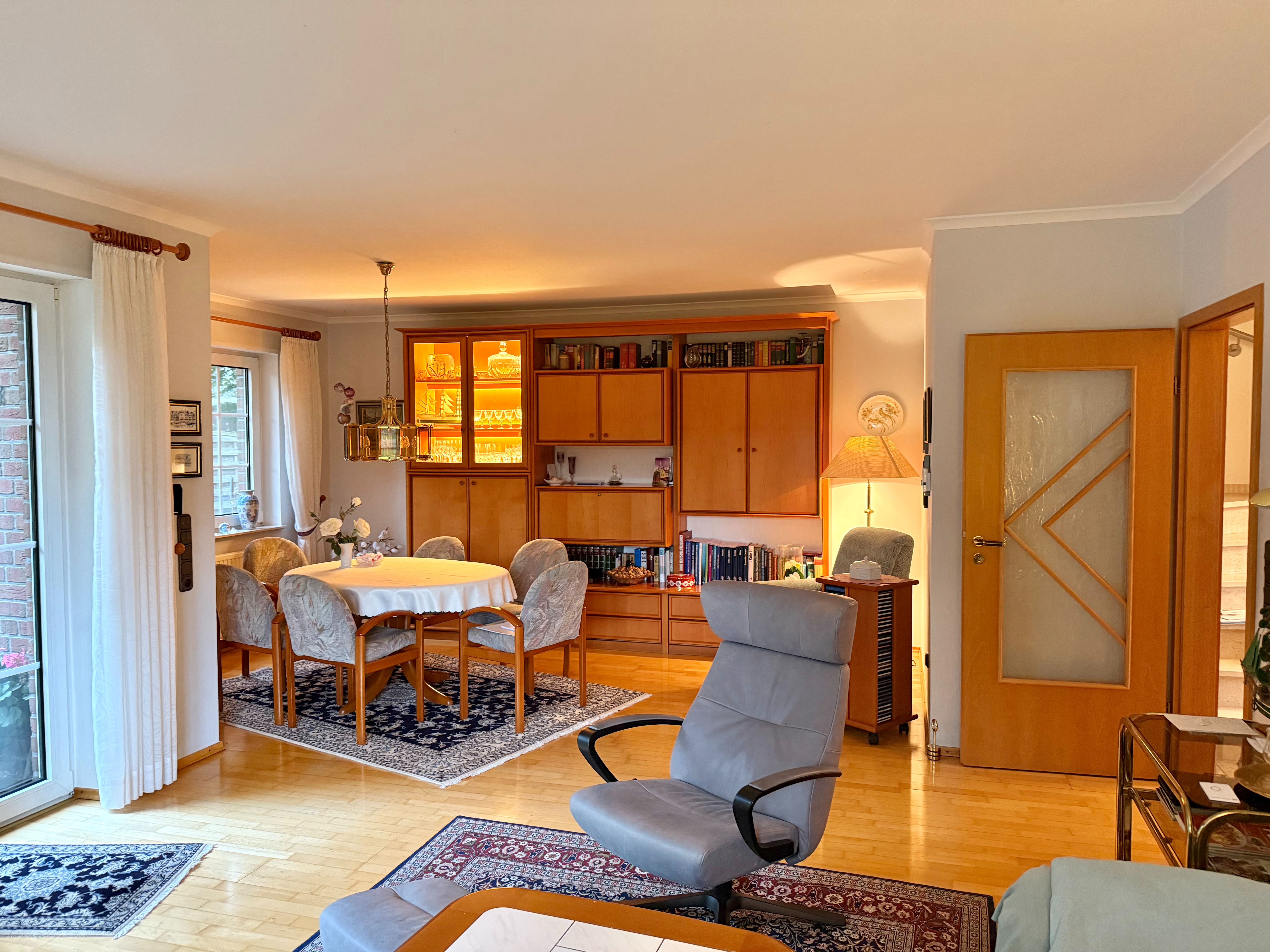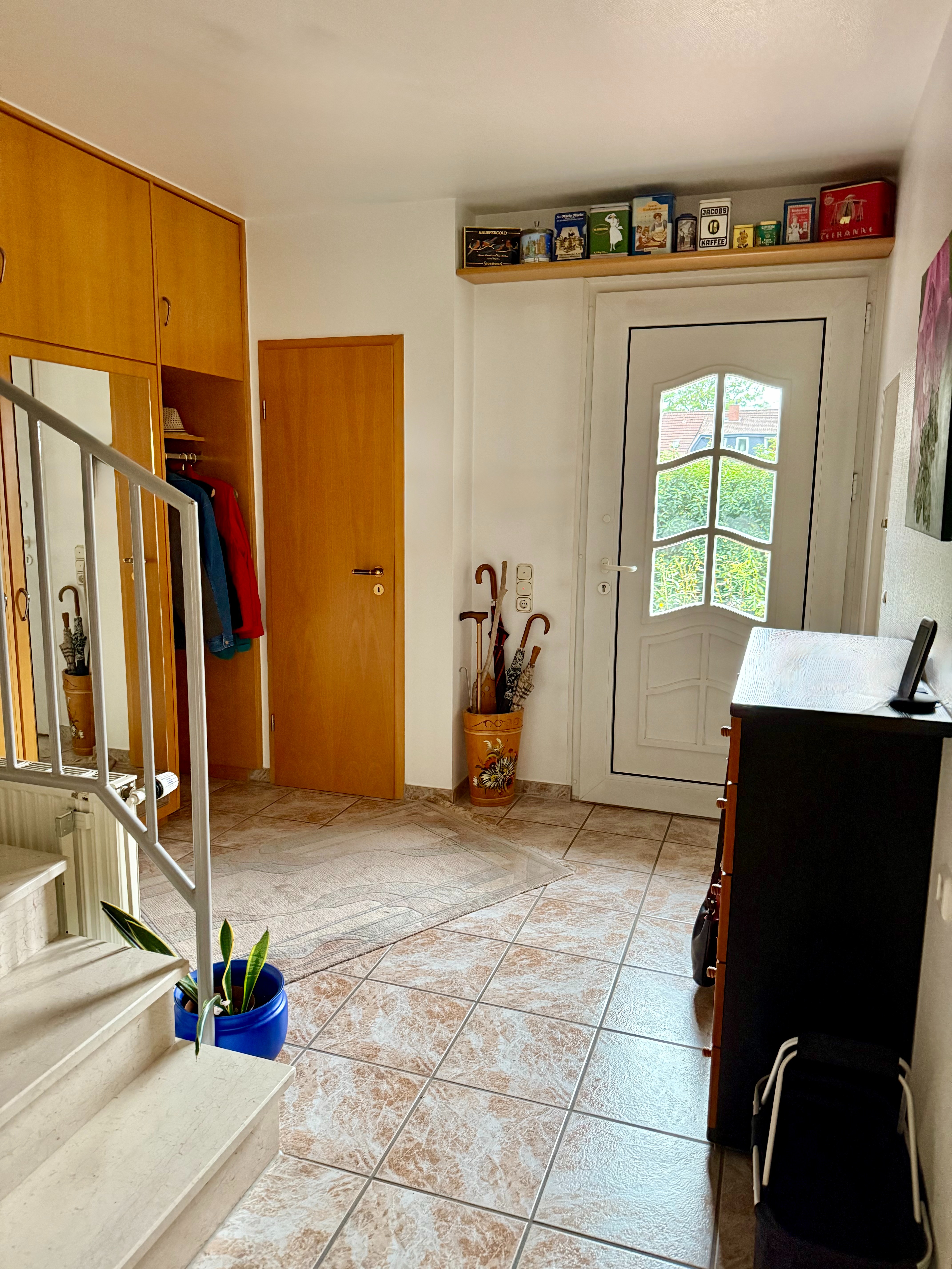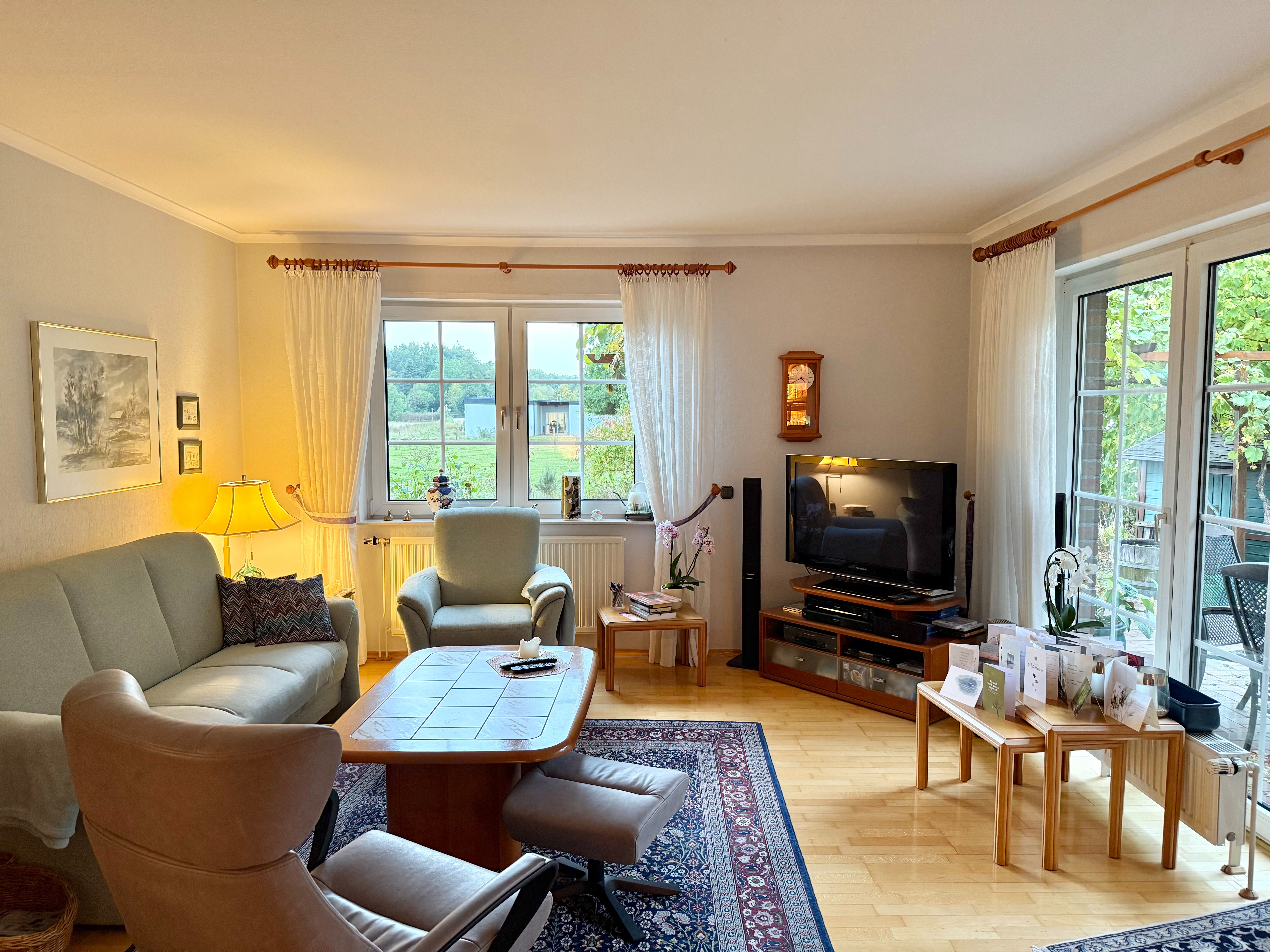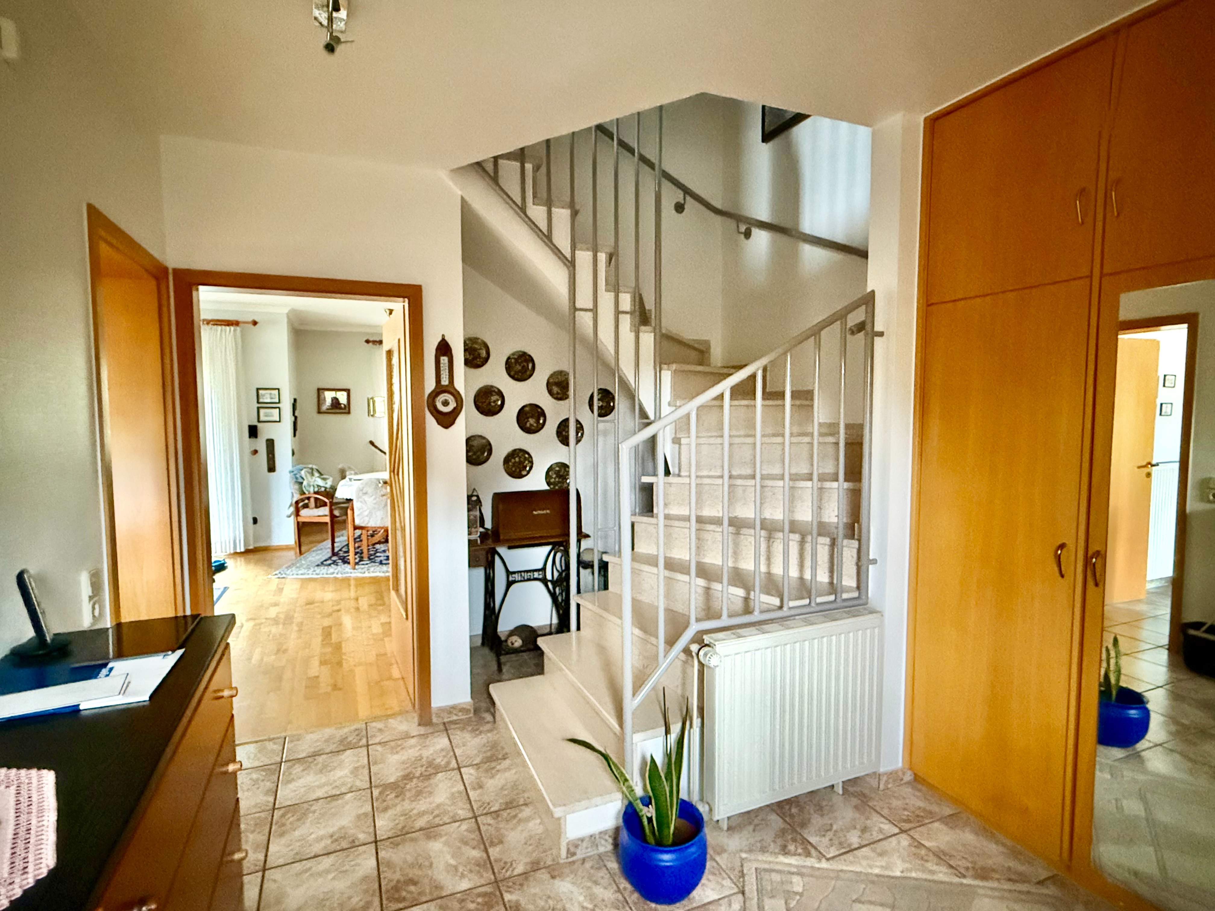 Das Haus überzeugt durch seinen praktischen Grundriss und ein helles, freundliches Wohnambiente. Im Erdgeschoss erwartet Sie ein einladendes Wohnzimmer mit Zugang zur Terrasse, die teilweise über Eck verläuft und einen wunderbaren Blick in den gepflegten Garten bietet. Der grüne Außenbereich ist liebevoll angelegt und lädt mit seiner ruhigen Atmosphäre zum Entspannen ein.
