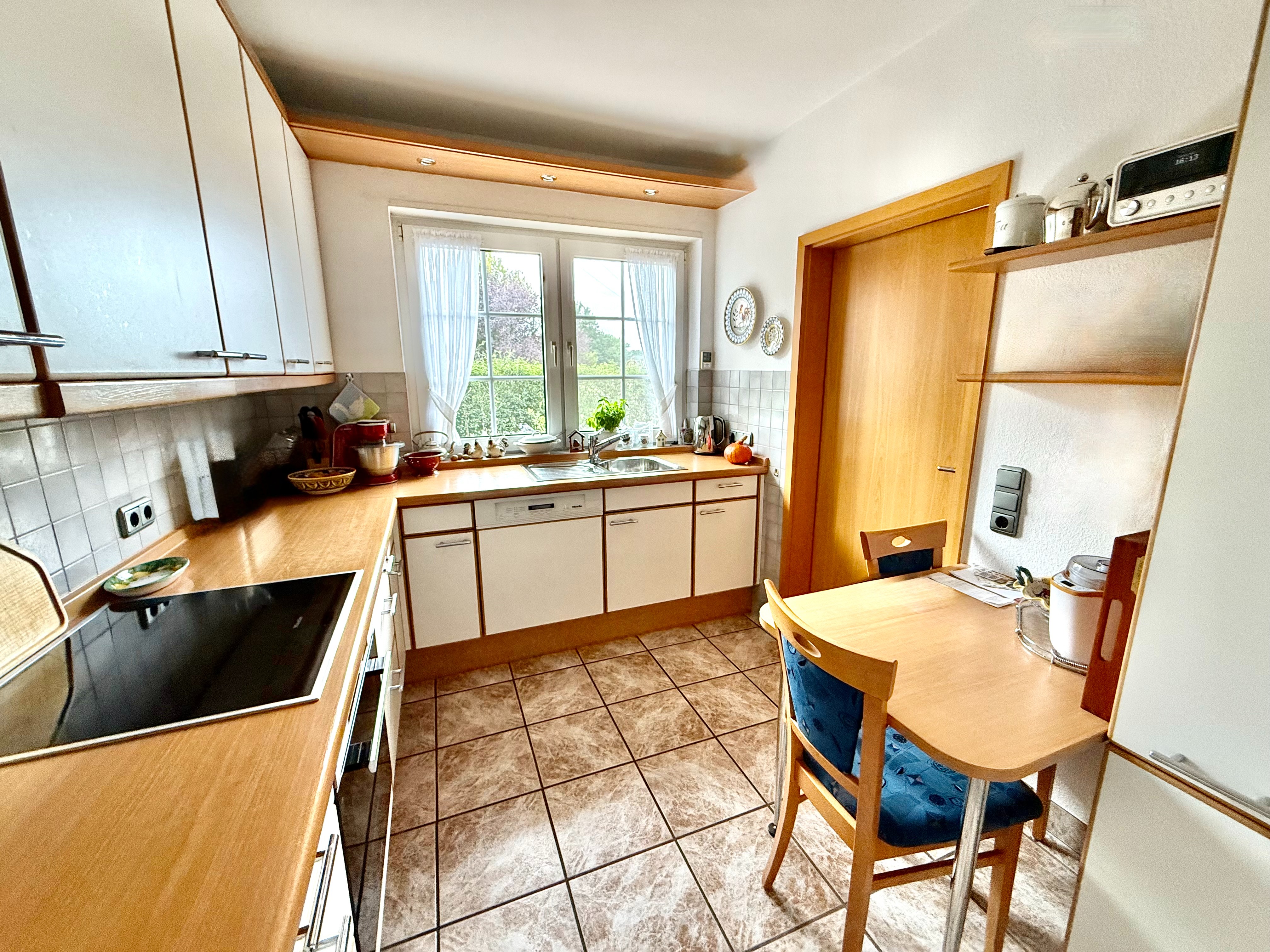 Die Küche ist mit einer Einbauküche ausgestattet und verfügt über einen praktischen Abstellraum, von dem aus sich eine zweite Terrasse mit direktem Zugang in den Garten öffnet, perfekt für sommerliche Koch- und Grillabende. Ergänzt wird das Erdgeschoss durch ein Gäste-WC direkt neben dem Eingangsbereich.
