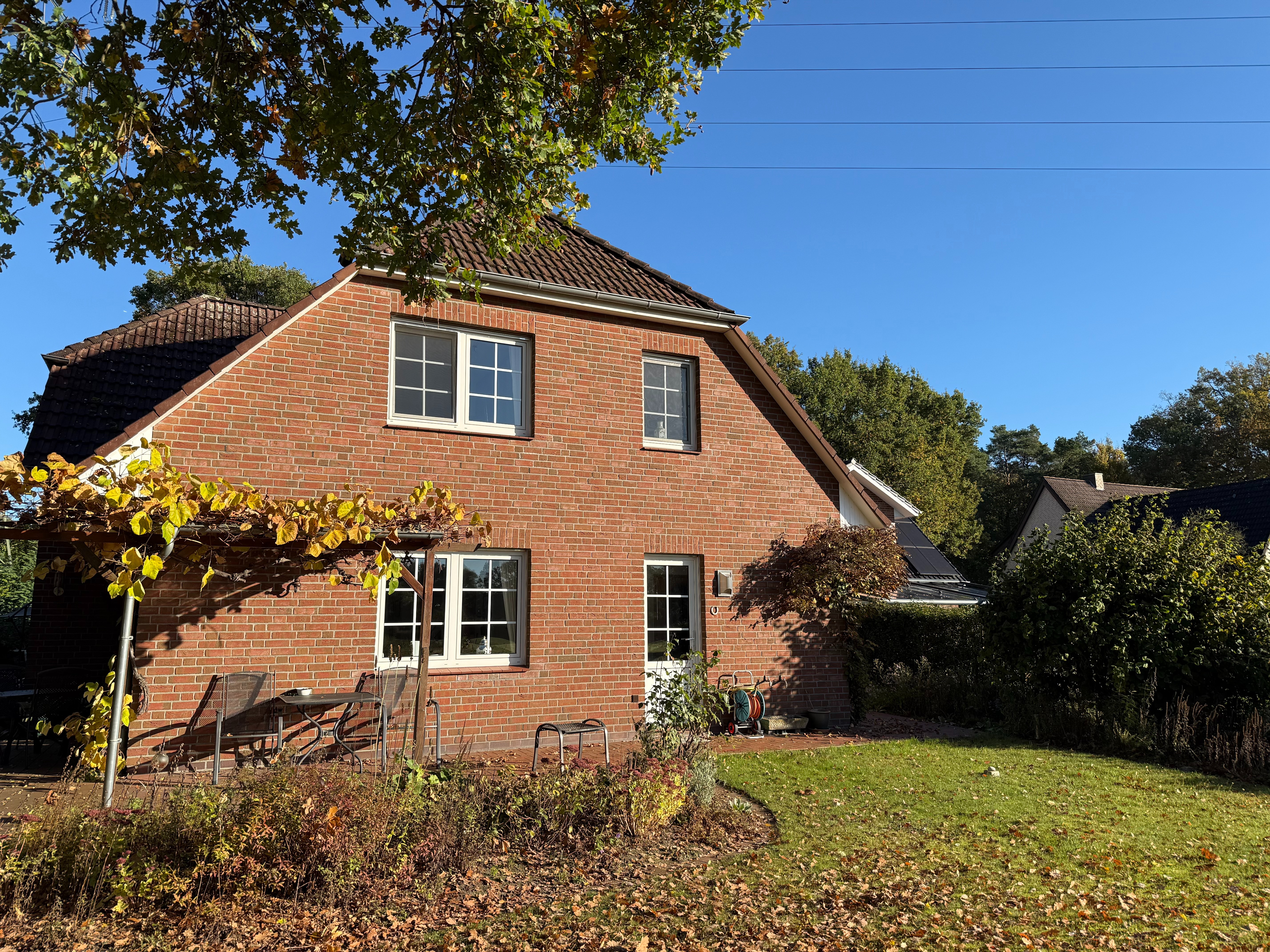 Das Haus überzeugt durch seinen praktischen Grundriss und ein helles, freundliches Wohnambiente. Im Erdgeschoss erwartet Sie ein einladendes Wohnzimmer mit Zugang zur Terrasse, die teilweise über Eck verläuft und einen wunderbaren Blick in den gepflegten Garten bietet. Der grüne Außenbereich ist liebevoll angelegt und lädt mit seiner ruhigen Atmosphäre zum Entspannen ein.